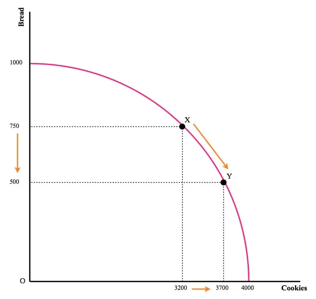 - It is concave to the origin: The Production Possibility Curve is concave to the origin, which is based on the concept of increasing marginal rate of transformation. When the resources are withdrawn from one commodity to increase the production of another commodity, the marginal rate of transformation increases, i.e., MRT increases.